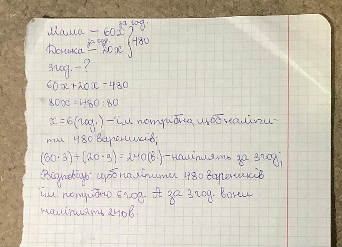 Мама з донькою на Різдво вирішили наліпити вареників. Мати за 1 годину може наліпити 60 вареників, а донька лише 20. Скільки вареників вони зможуть наліпити за 3 години? Скільки часу їм потрібно, щоб наліпити 480 вареників? Умову до задачі записати у вигляді таблиці