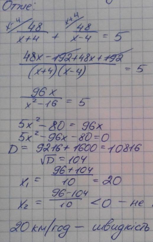 Теплохід пройшов за течією річки 48 км і стільки само проти течії, затративши на весь шлях 5 год. Знайти власну швидкість теплохода, якщо швидкість течії річки становить 4 км/год.