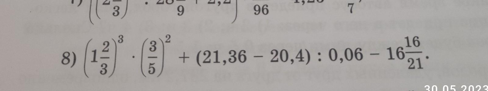 № 956 8) (1 целых 2/3)³×(3/5)²+(21,36-20,4):0,06-16 целых 16/21