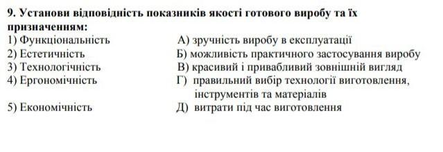 9. Установи відповідність показників якості готового виробу та їх призначенням: 1) Функціональність 2) Естетичність 3) Технологічність 4) Ергономічність 5) Економічність А) зручність виробу в експлуатації Б) можливість практичного застосування виробу В) красивий і привабливий зовнішній вигляд Г) правильний вибір технології ви інструментів та матеріалів Д) витрати під час виготовлення