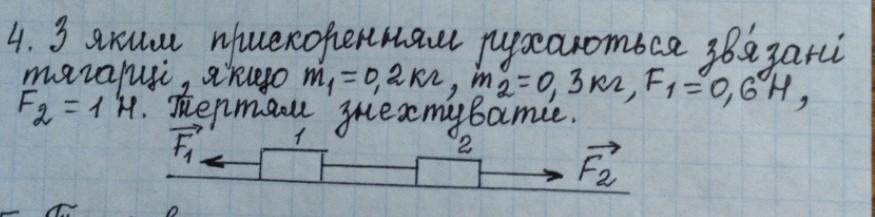 з якими прискореннями рухаються зв'язані тягарці якщо m¹=0.2 кг m²=0.3кг F¹=0.6 H F²=1H тертям знехтувати