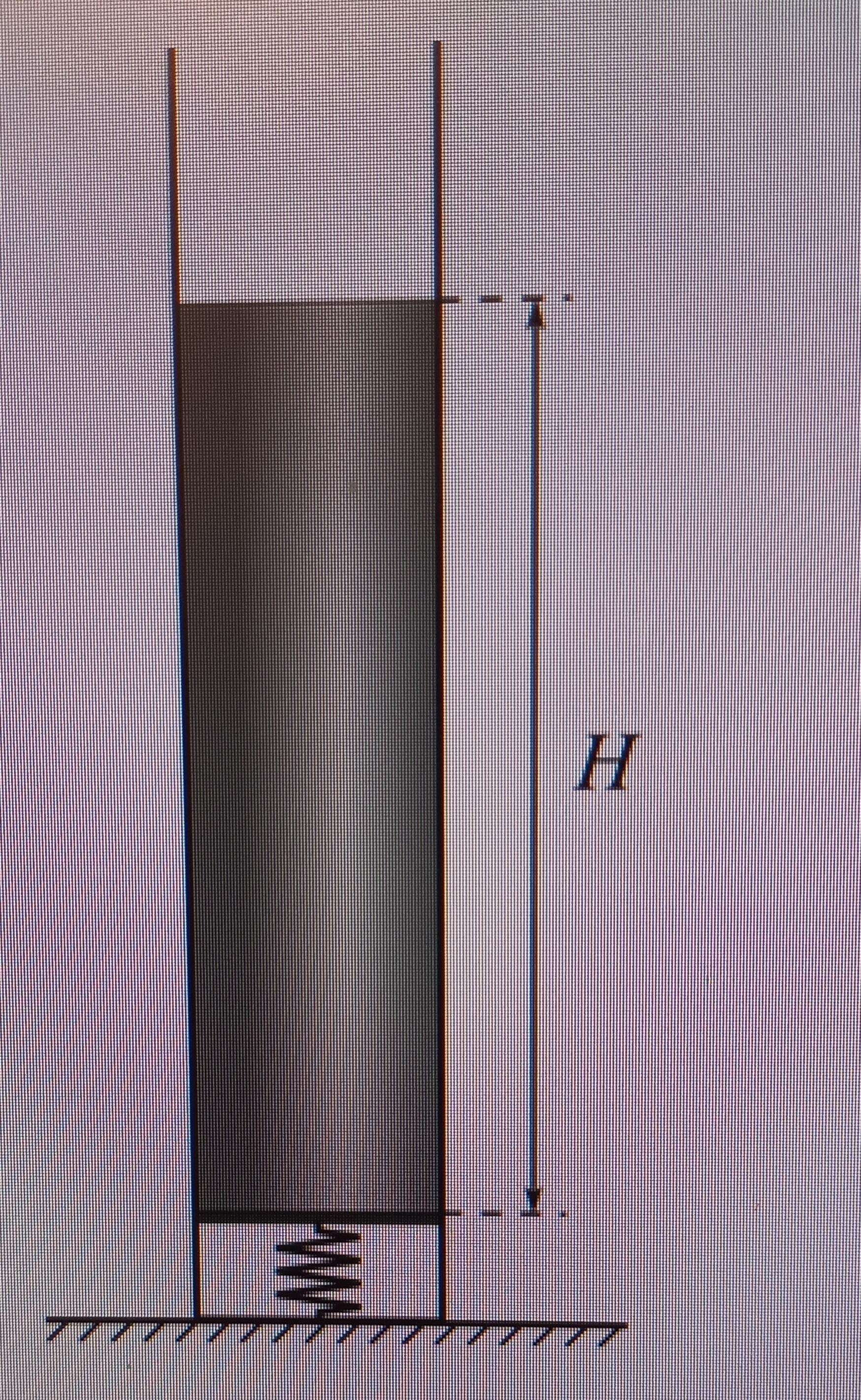 Ко дну цилиндрического сосуда на пружине прикреплён невесомый поршень, из-под которого откачан воздух. В сосуд заливают столб керосина высотой H=10 см(см. рисунок) Сила, действующая на пружину равна 450 Н.Найти диаметр дна сосуда. Ответ выразить в см.