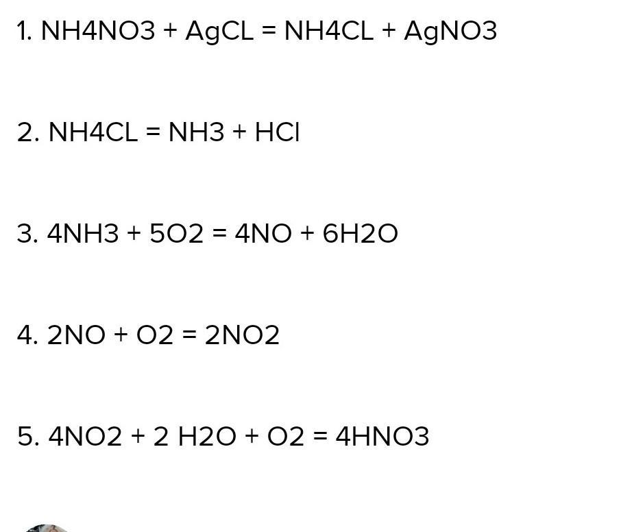 Запропонуйте рівняння реакції , за допомогою яких можна здійснити перетворення :N2-NH3-NO- NH4Cl- NH3-NO2- HNO3-NO3.
