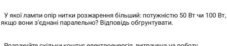 Отже, за умови, що напруга однакова для обох ламп, лампа з більшою потужністю буде мати менший опір нитки розжарення. Тому, лампа потужністю 100 Вт матиме більший опір нитки розжарення порівняно з лампою потужністю 50 Вт.