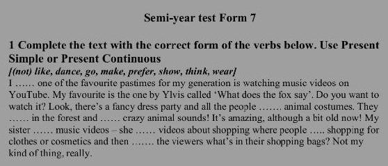 1 Complete the text with the correct form of the verbs below. Use Present Simple or Present Continuous [(not) like, dance, go, make, prefer, show, think, wear] I ...... one of the favourite pastimes for my generation is watching music videos on YouTube. My favourite is the one by Ylvis called 'What does the fox say'. Do you want to watch it? Look, there's a fancy dress party and all the people :....... animal costumes. They in the forest and crazy animal sounds! It's amazing, although a bit old now! My ***** videos about shopping where people shopping for the viewers what's in their shopping bags? Not my www. sister music videos - she clothes or cosmetics and then kind of thing, really. ******** K