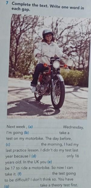 Next week, on Wednesday, I'm going to take a test on my motorbike. The day before, I had my last practice lesson. I didn't do my test last year because I was only 16 years old. In the UK you must be 17 to ride a motorbike. So now I can take it. Is the test going to be difficult? I don't think so. You have to take a theory test first.