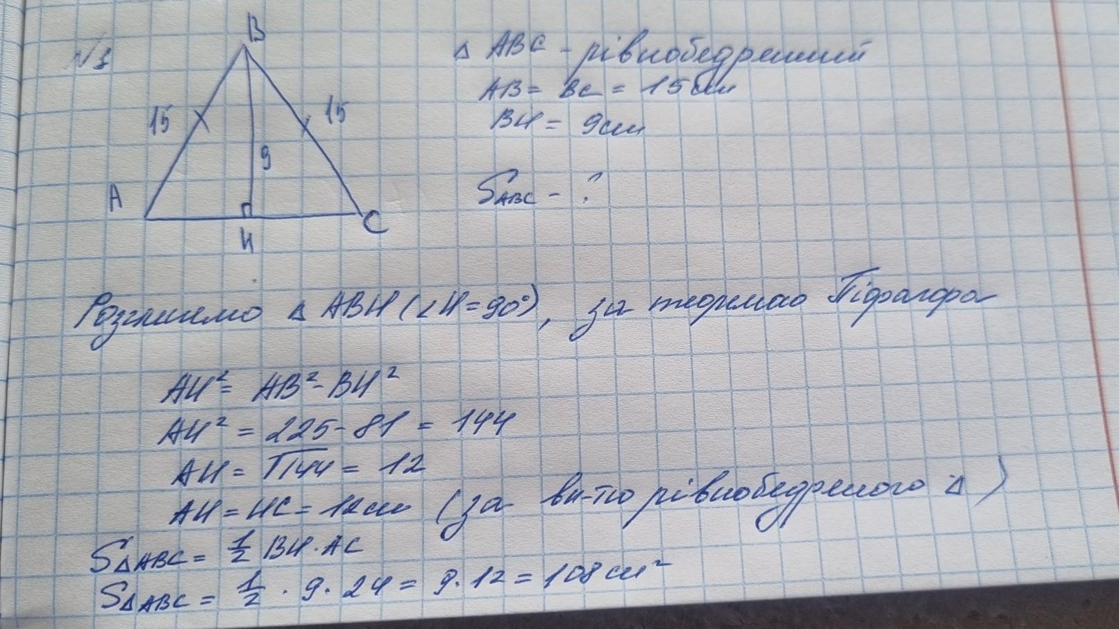 Знайдіть площу рівнобедреного трикутника, бічна сторона якого дорівнює 15 см, а висота, проведена до основи-9см