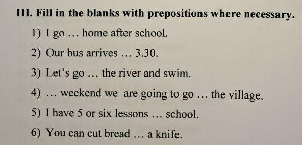 1. I go home 2. Our bus arrives at 3. Let's go to 4. At weekend we are going to go to the village. 5. I have 5 or 6 lessons at school. 6. You can cut bread with a knife.