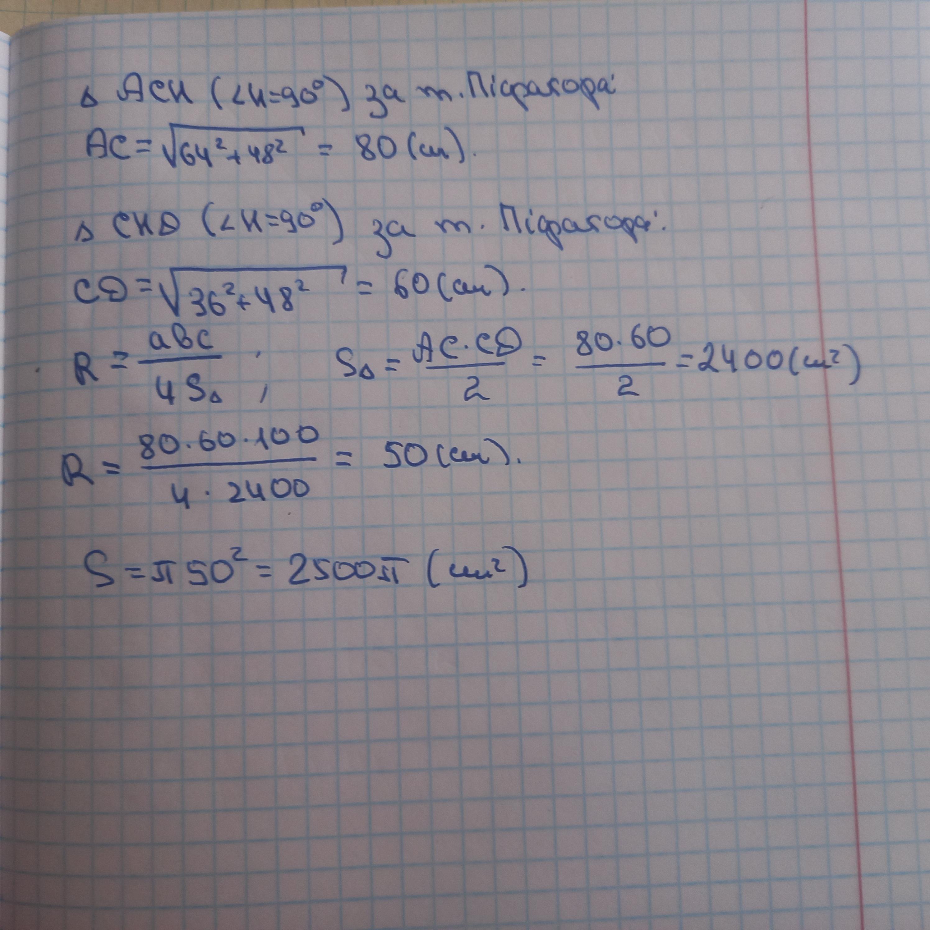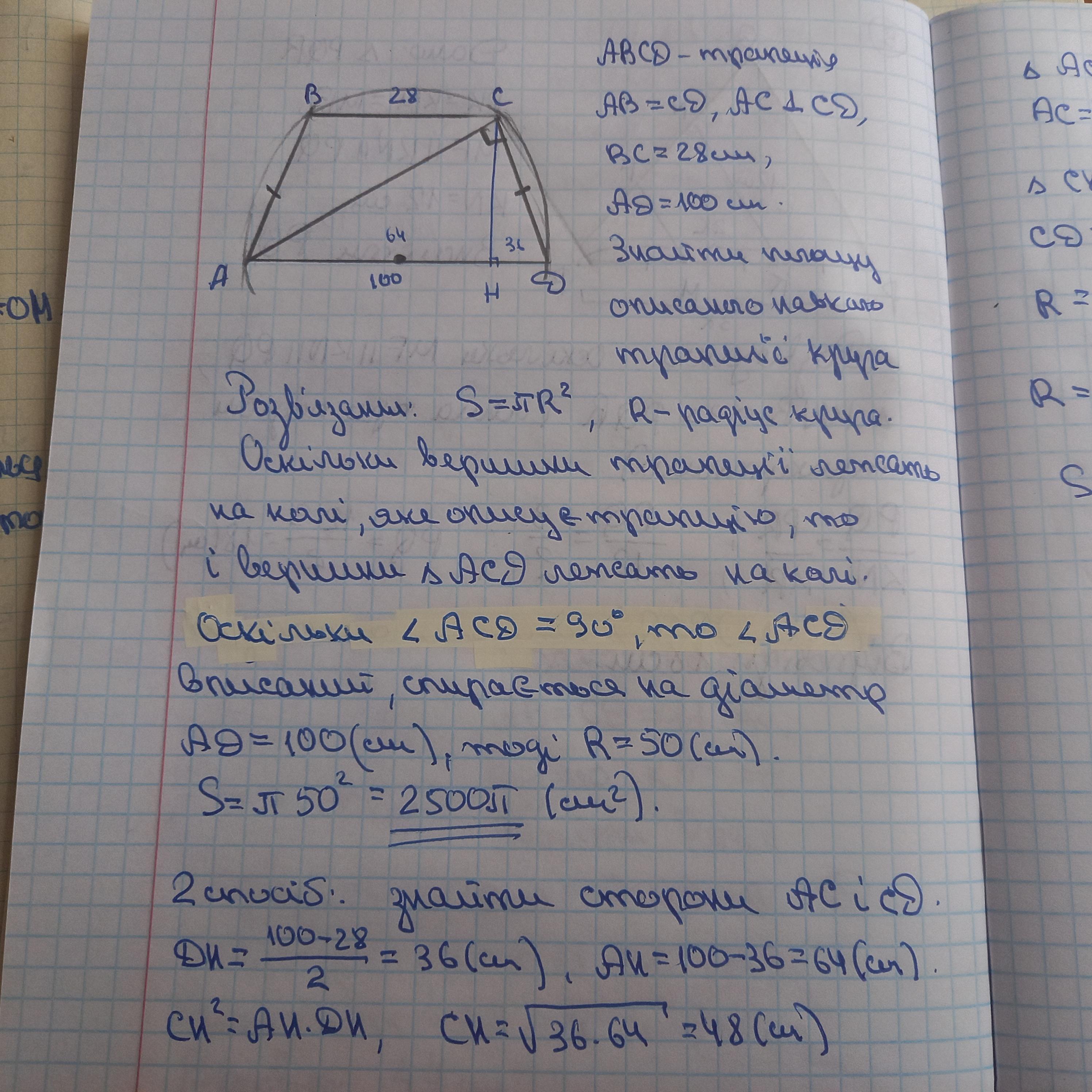 діагональ рівно бічної трапеції перпендикулярна до бічної сторони а основи дорівнюють 28см і 100см знайти площу круга описаного навколо трапеції