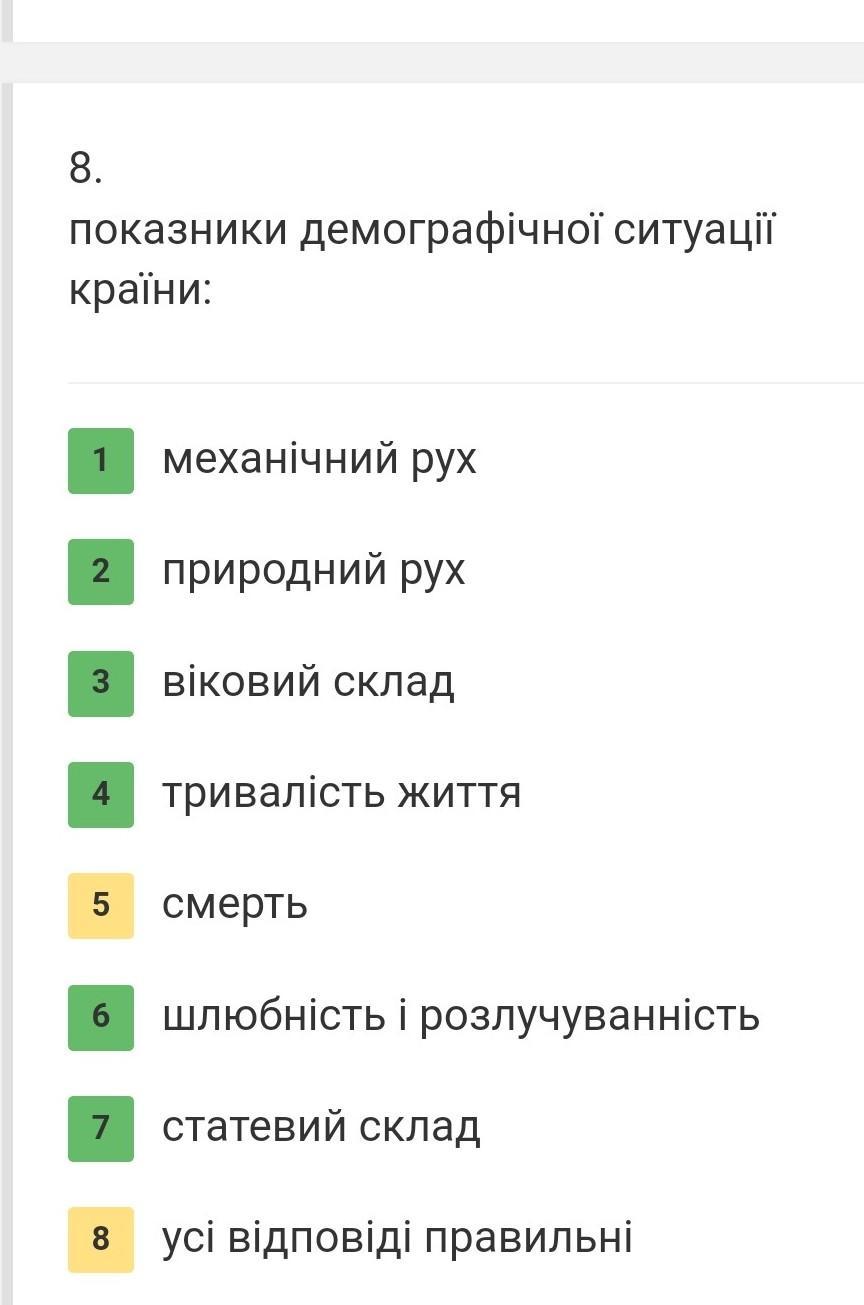 8. Показники демографічної ситуації країни: А) механічний рух Г) тривалість життя Б) природний рух Д) смерть В) віковий склад Е) шлюбність і розлучуванність Ж) статевий склад 3) усі відповіді правильні