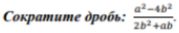 \frac{ {a}^{2}  - 4 {b}^{2} }{2b {}^{2}  + ab}  =  \frac{(a - 2b)(a + 2b)}{b(2b + a)}  =  \frac{a - 2b}{b}