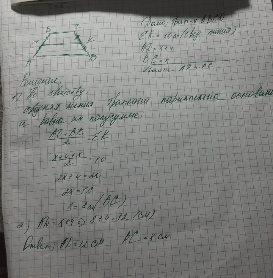 средняя линия трапеции параллельна основаниям и равна их полусумме