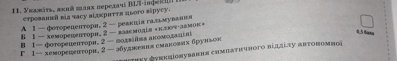 Відповідь:ВІЛ-інфекція не передається через фоторецептори, хеморецептори, реакцію гальмування взаємодії ключ-замок, акомодацію або збудження смакових бруньок. ВІЛ передається через контакт інфікованої крові, сечі, вагінальних виділень, сперми або материнського молока зі здоровою особою. Також можливий ризик передачі ВІЛ через спільне вживання наркотиків, неконтрольований сексуальний контакт, татуювання або пірсинг за нестерильних умов, а також від матері до дитини під час вагітності, пологів або годування грудьми.
