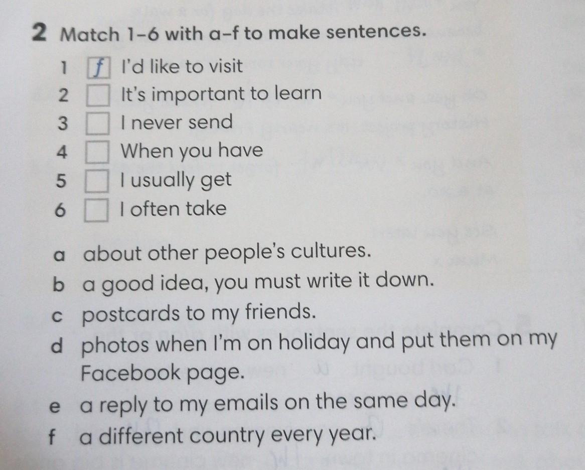 2 Match 1-6 with a-f to make sentences, 1 [f] I'd like to visit 2 6 It's important to learn I never send When you have I usually get I often take a about other people's cultures, b a good idea, you must write it down. postcards to my friends. e d photos when I'm on holiday and put them on my Facebook page. e a reply to my emails on the same day. a different country every year, ПОЖАЛУЙСТА ПОМОГИТЕ ОЧЕНЬ НАДО