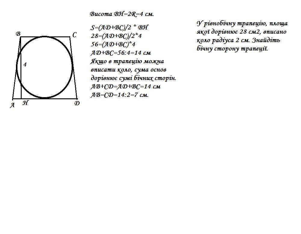 (ДАЮ 100 БАЛОВ )У рівнобічну трапецію, площа якої дорівнює 28 см2, вписано коло радіуса 2 см. Знайдіть бічну сторону трапеції.(З малюнком)