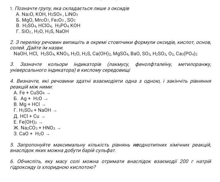 5. Запропонуйте максимальну кiлькiсть рiвнянь неоднотипних хімічних реакцій, внаслідок яких можна добути барій сульфат. 6. Обчисліть, яку масу солі можна отримати внаслідок взаємодії 200 г натрій гідроксиду iз хлоридною кислотою?
