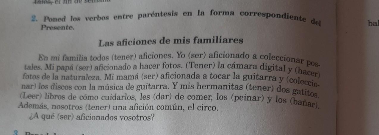 2. Poned los verbos entre paréntesis en la forma correspondiente del Presente. Las aficiones de mis familiares pos- En mi familia todos (tener) aficiones. Yo (ser) aficionado a coleccionar tales. Mi papá (ser) aficionado a hacer fotos. (Tener) la cámara digital y (hacer) fotos de la naturaleza. Mi mamá (ser) aficionada a tocar la guitarra y (coleccio- nar) los discos con la música de guitarra. Y mis hermanitas (tener) dos gatitos. (Leer) libros de cómo cuidarlos, les (dar) de comer, los (peinar) y los (bañar). Además, nosotros (tener) una afición común, el circo. ¿A qué (ser) aficionados vosotros?