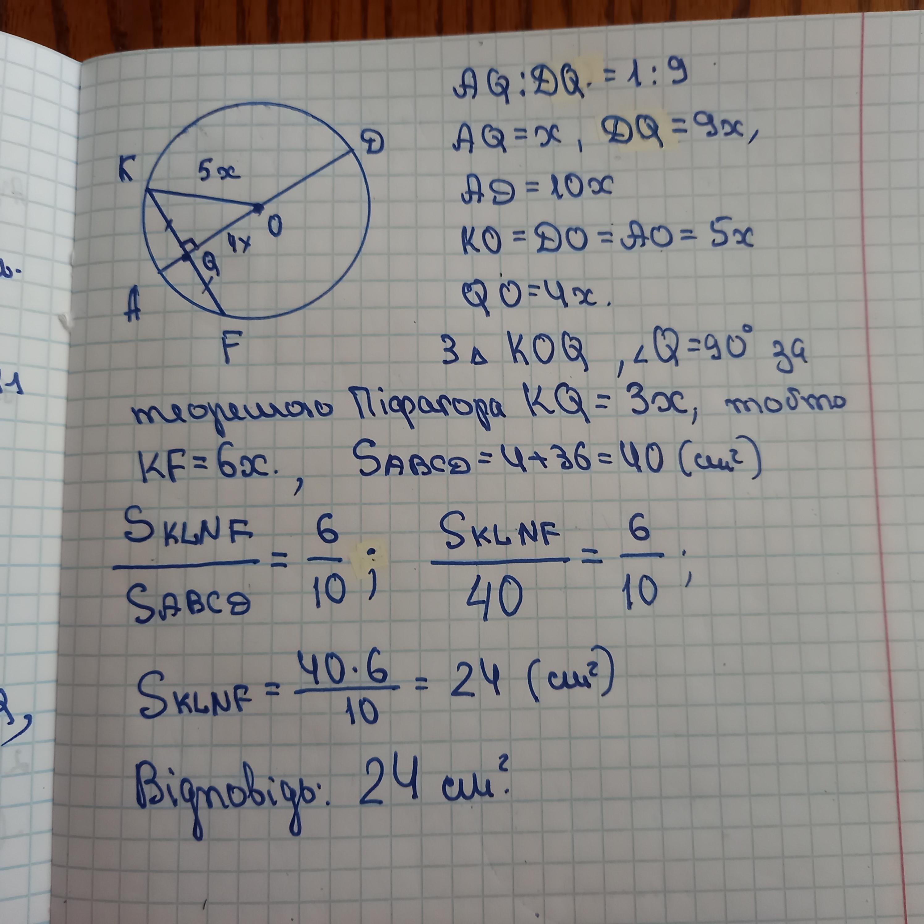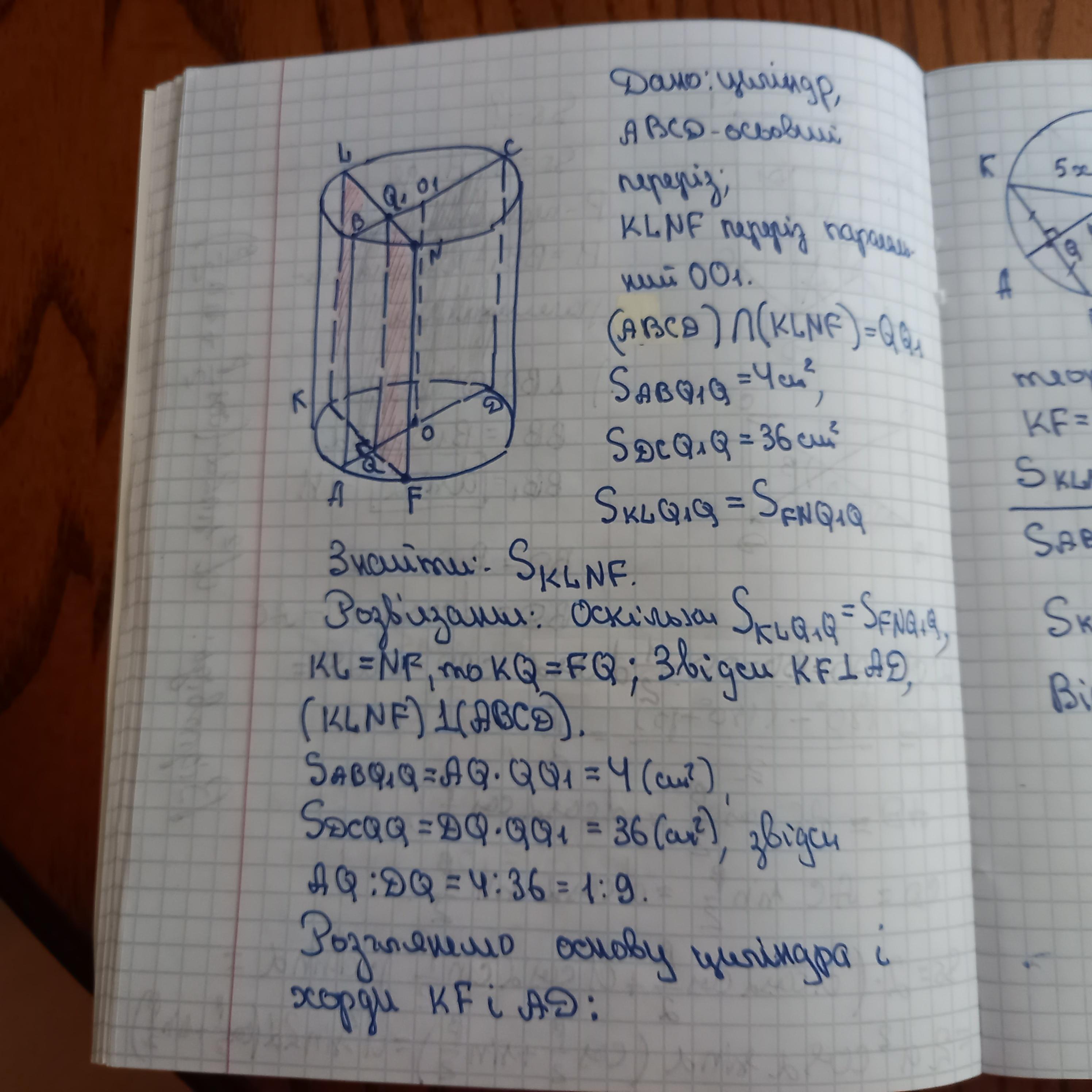 Переріз циліндра, паралельний осі, перетинається з осьовим перерізом, причому пряма перетину ділить осьовий переріз на частини величиною 4 см² і 36 см², а переріз, паралельний осі, на дві рівновеликі частини. Знайдіть площу перерізу, паралельного oci.
