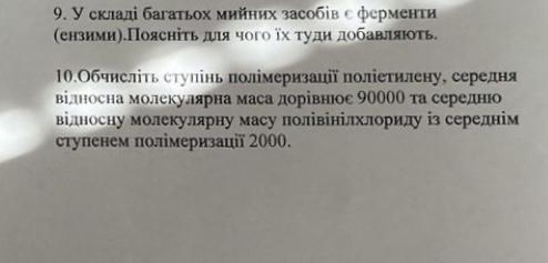 Обчисліть ступінь полімеризації поліетилену, середня відносна молекулярна маса = 90000 та середню відносну молекулярну масу полівінілхлориду із середнім ступенем полімеризації 2000.
