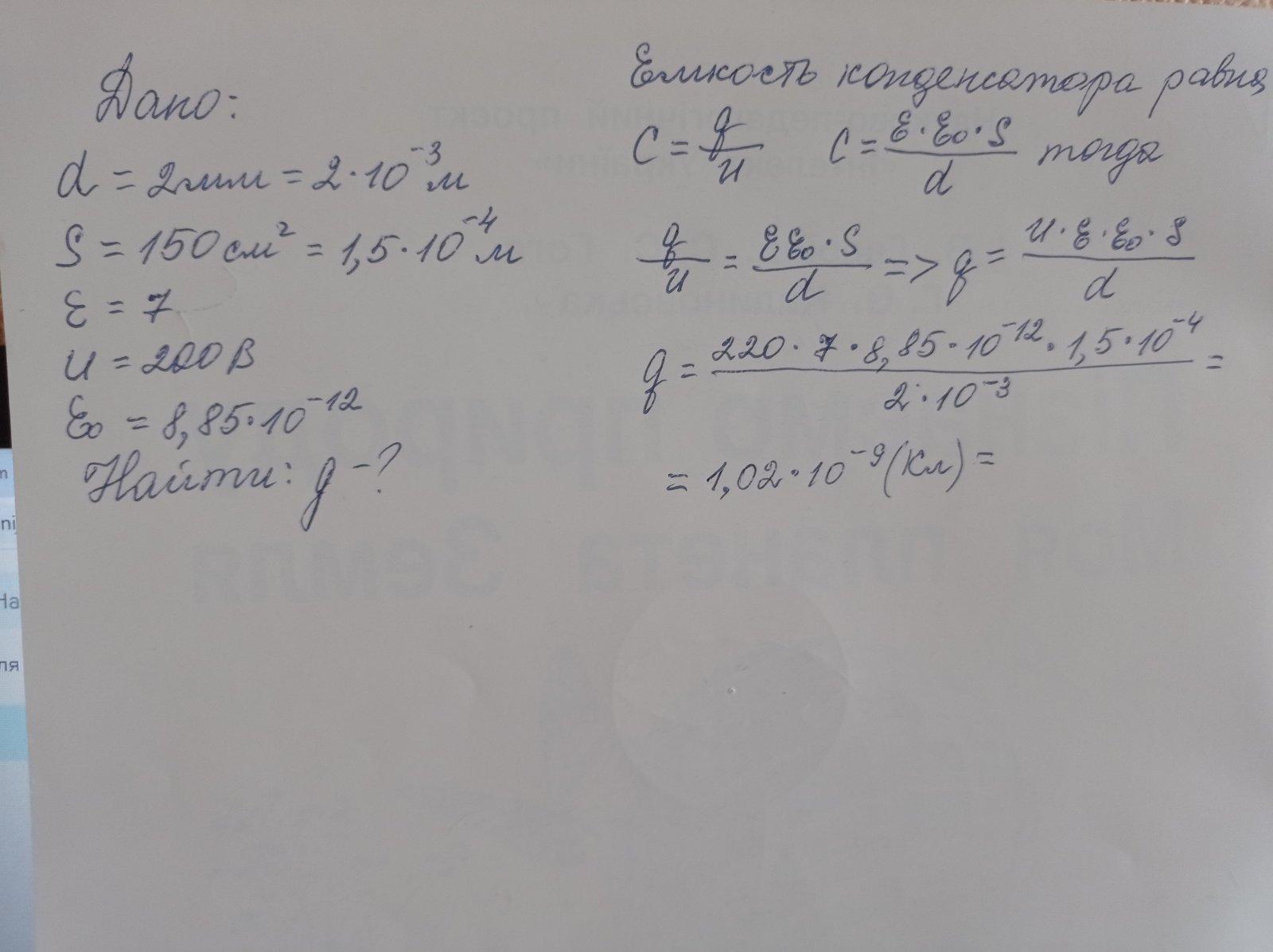Плоский конденсатор складається з двох пластин площею 150 см² кожна, розміщених на відстані 2,0 мм одна від одної і розділених шаром слюди. Конденсатор зарядили до напруги 200 В. Визначте заряд конденсатора