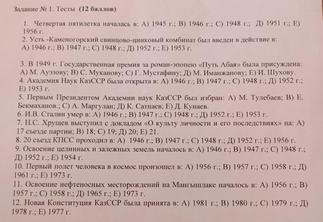 Задание № 1. Тесты (12 баллов) 1. Четвертая пятилетка началась в: А) 1945 г.; В) 1946 г.; С) 1948 г.; Д) 1951 г.; E) 1956 г. 2. Усть-Каменогорский свинцово-цинковый комбинат был введен в действие в: А) 1946 г.; В) 1947 г.; С) 1948 г.; Д) 1952 г.; Е) 1953 г. 3. В 1949 г. Государственная премия за роман-эпопею «Путь Абая» была присуждена: А) М. Ауэзову; В) С. Муканову; С) Г. Мустафину; Д) М. Иманжанову; Е) И. Шухову. 4. Академия Наук КазССР была открыта в: А) 1946 г.; В) 1947 г.; С) 1948 г.; Д) 1952 г.; E) 1953 г. 5. Первым Президентом Академии наук КазСCP был избран: А) М. Тулебаев; В) Е. Бекмаханов.; С) А. Маргулан; Д) К. Сатпаев; Е) Д. Кунаев. 6. И.В. Сталин умер в: А) 1946 г.; В) 1947 г.; С) 1948 г.; Д) 1952 г.; Е) 1953 г. 7. Н.С. Хрущев выступил с докладом «О культу личности и его последствиях» на: А) 17 съезде партии; В) 18; С) 19; Д) 20; Е) 21. 8. 20 съезд КПСС проходил в: А) 1946 г.; В) 1947 г.; С) 1948 г.; Д) 1952 г.; Е) 1956 г. 9. Освоение целинных и залежных земель началось в: А) 1946 г.; В) 1947 г.; С) 1948 г.; Д) 1952 г.; Е) 1954 г. 10. Первый полет человека в космос произошел в: А) 1956 г.; В) 1957 г.; С) 1958 г.; Д) 1961 г.; Е) 1973 г. 11. Освоение нефтеносных месторождений на Мангышлаке началось в: А) 1956 г.; В) 1957 г.; С) 1958 г.; Д) 1965 г.; Е) 1973 г. 12. Новая Конституция КазССР была принята в: А) 1981 г.; В) 1980 г.; С) 1979 г.; Д) 1978 г.; E) 1977 г.