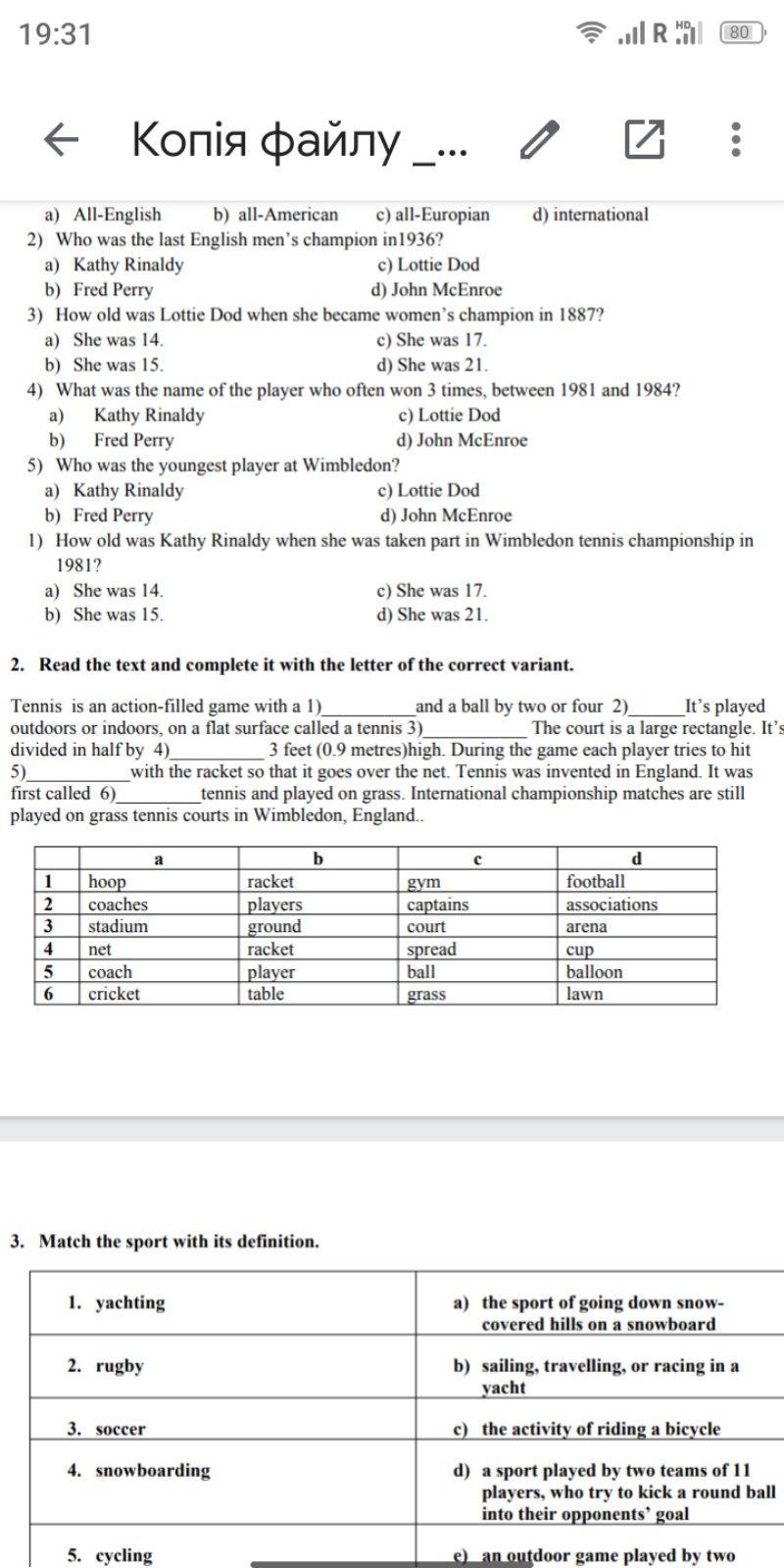 Tennis is an action-filled game with a ball and a racket played by two or four players. It's played outdoors or indoors, on a flat surface called a tennis court. The court is a large rectangle. It's divided in half by a net 3 feet (0.9 meters) high. During the game, each player tries to hit the ball with the racket so that it goes over the net. Tennis was invented in England. It was first called lawn tennis and played on grass. International championship matches are still played on grass tennis courts in Wimbledon, England.