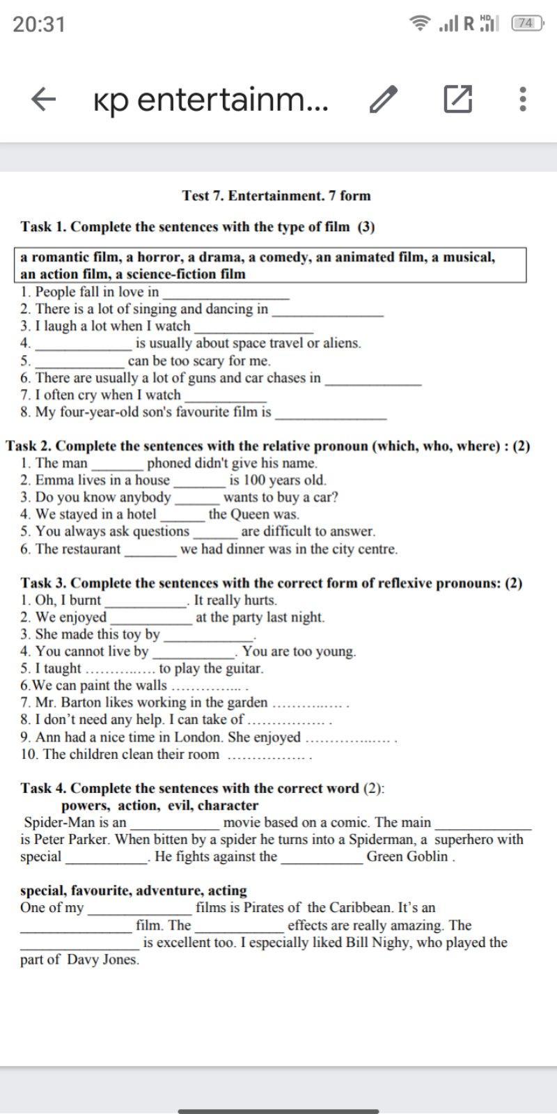 2. One of my favourite adventure films is Pirates of the Caribbean. It's a special film. The effects are really amazing. The acting is excellent too. I especially liked Bill Nighy, who played the character part of Davy Jones.