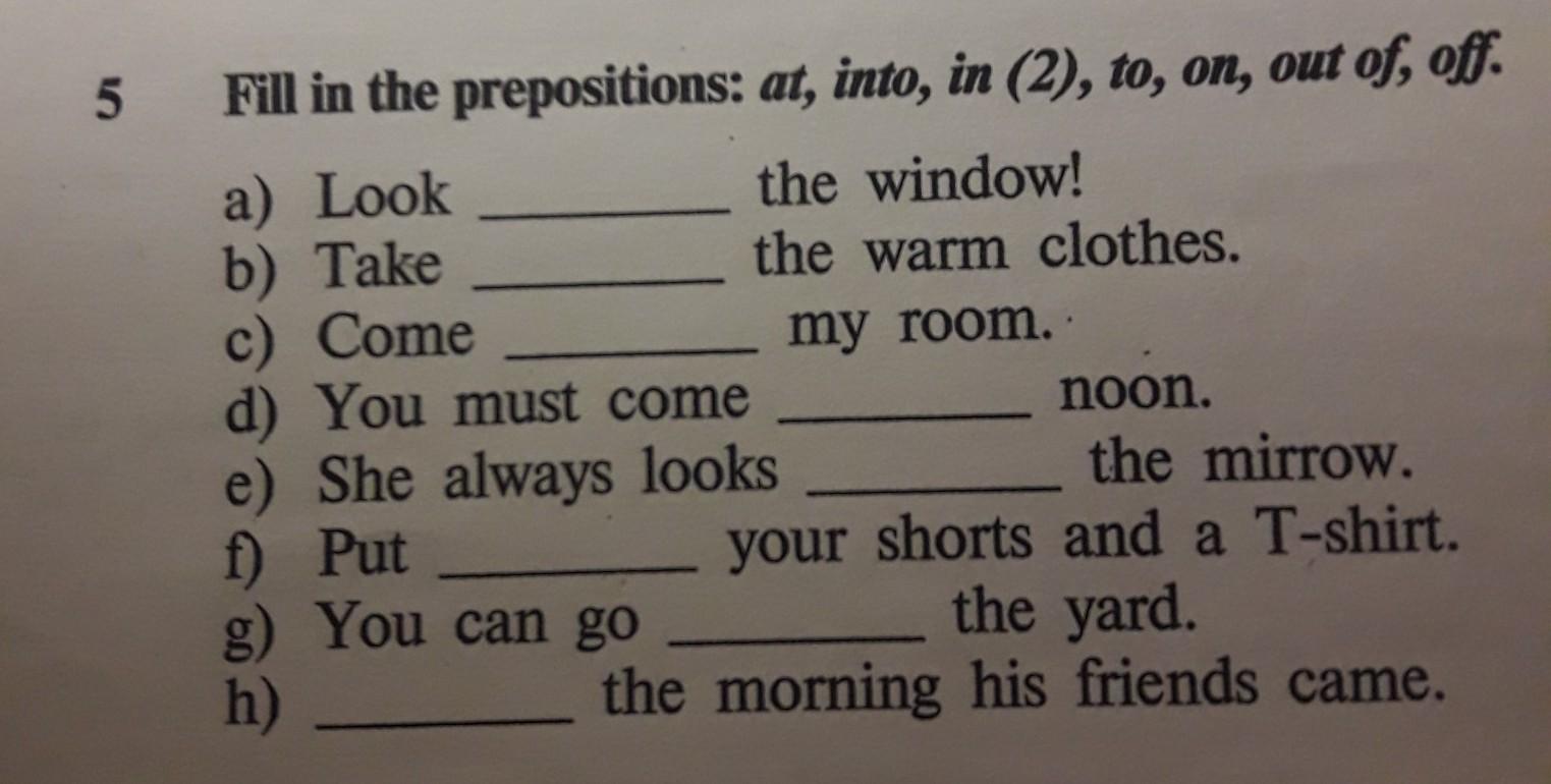 5. Fill in the prepositions: at, into, in (2), to, on, out of, off. помогите пожалуйста