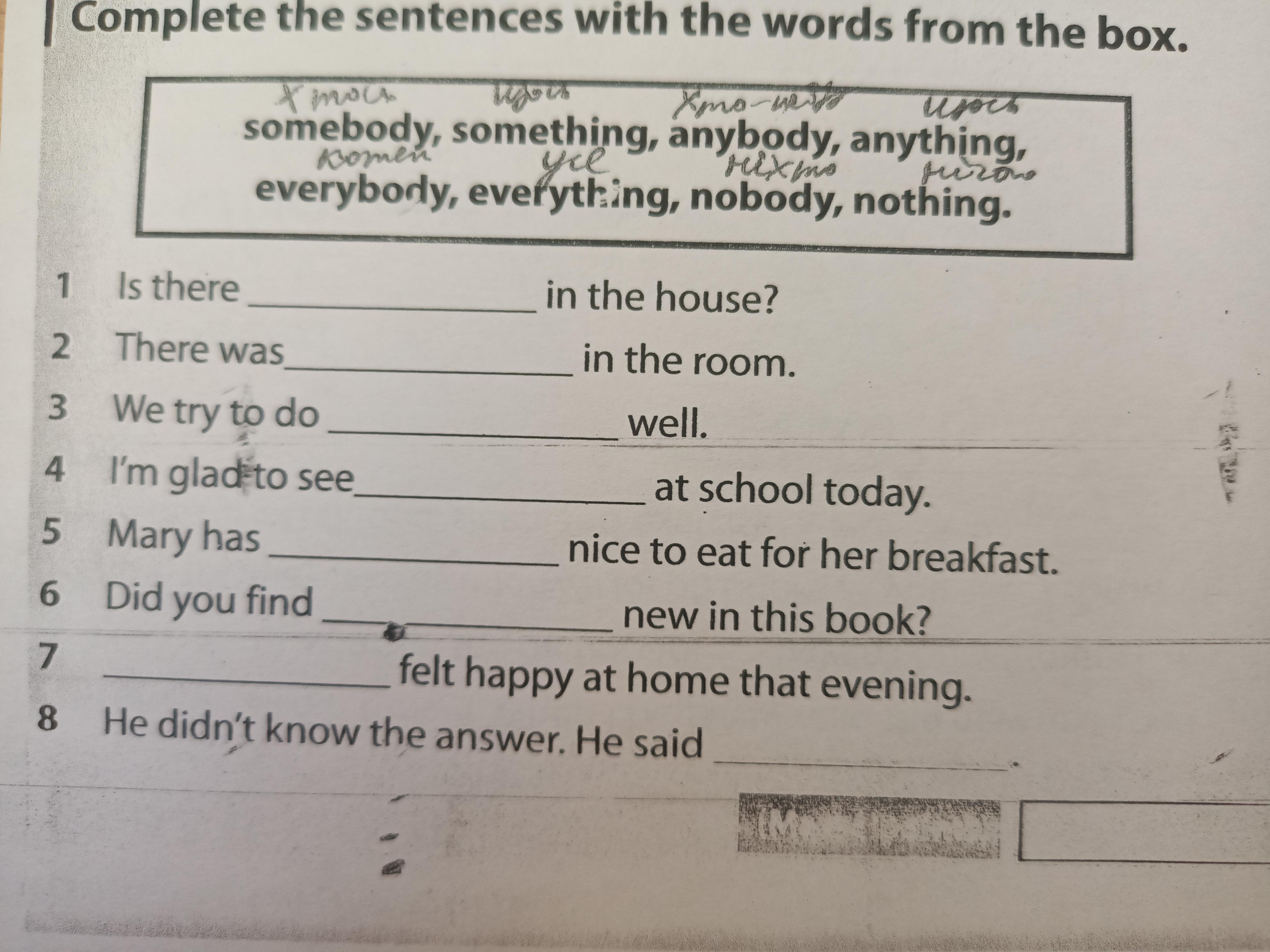 anybody, nobody, something, everybody, everything, anything, somebody, nothing.