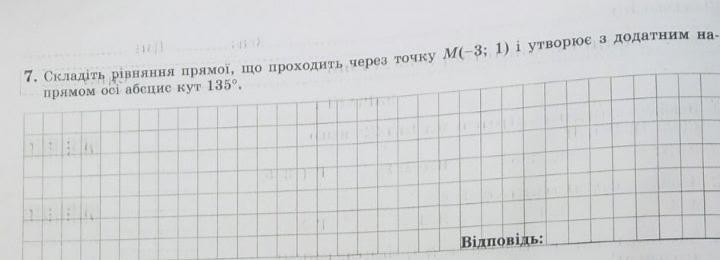 Складіть рівняння прямої, що проходить через точку M (-3; 1) і утворює з додатним напрямом осі абсцис кут 135°