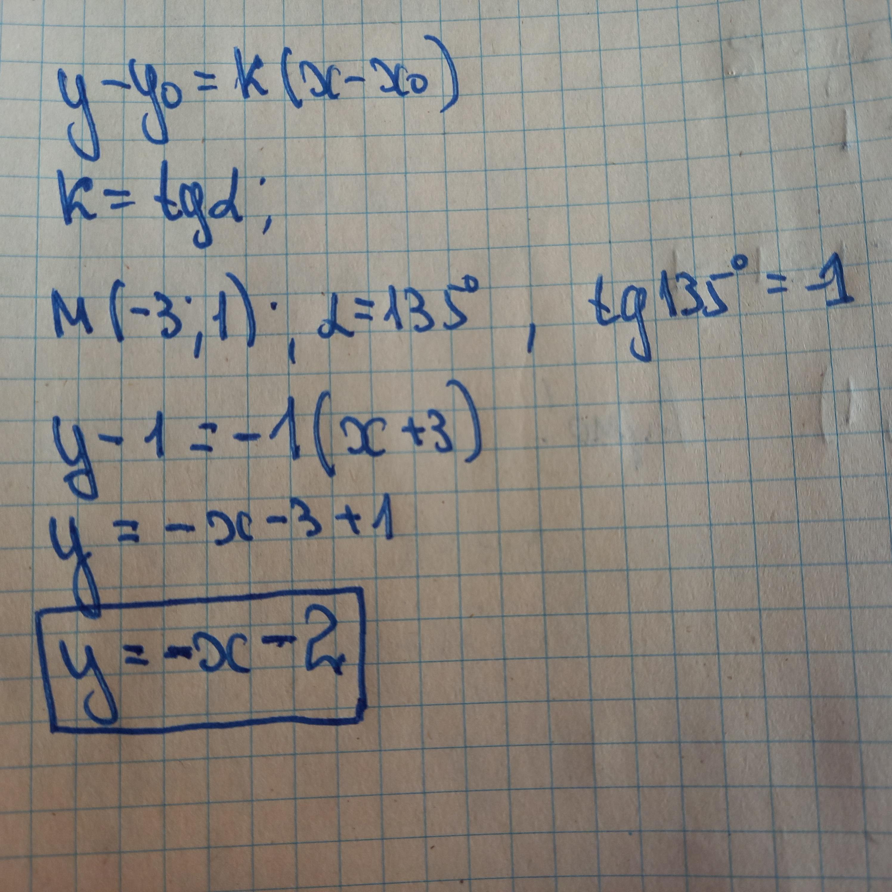 Составьте уравнение прямой, проходящей через точку M (-3; 1) и образующей с положительным направлением оси абсцисс угол 135°.
