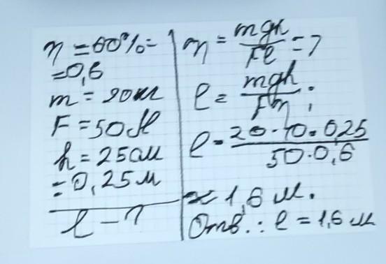 ККД похилої площини становить 60 %. Щоб пiдняти вантаж масою 20 кг. необхідно прикласти силу 50 Н. Якою є довжина Похилої площини , якщо її висота дорівнює 25 см.