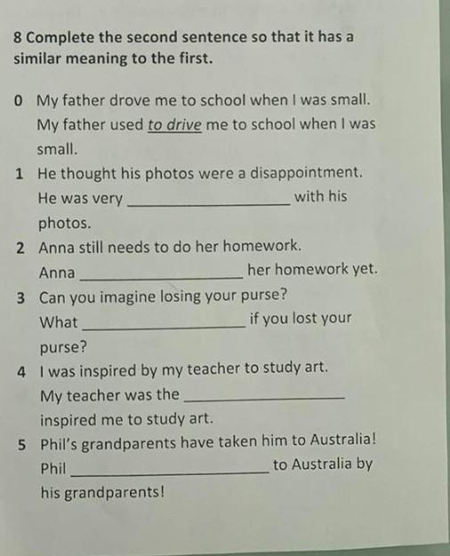 8 Complete the second sentence so that it has a similar meaning to the first. 0 My father drove me to school when I was small. My father used to drive me to school when I was small. 1 He thought his photos were a disappointment. He was very with his photos. 2 Anna still needs to do her homework. her homework yet. Anna 3 Can you imagine losing your purse? What if you lost your purse? 4 I was inspired by my teacher to study art. My teacher was the inspired me to study art. 5 Phil's grandparents have taken him to Australia! Phil to Australia by his grandparents!