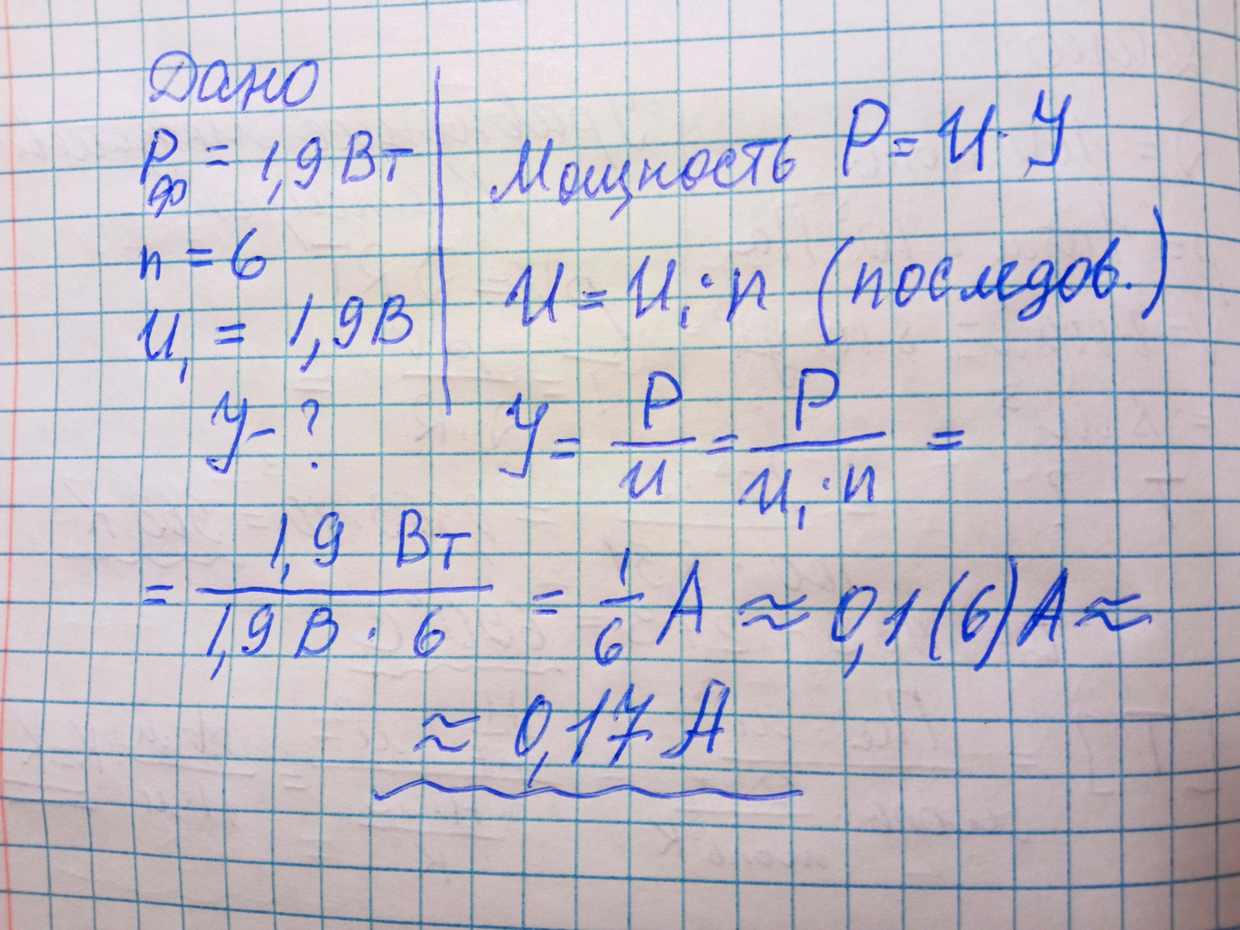 Мощность карманного фонарика равна 1,9 Вт. Определи силу тока, которую потребляет фонарик, если источником питания служат 6 батареек напряжением 1,9 В каждая, которые соединены последовательно. Перевод.
