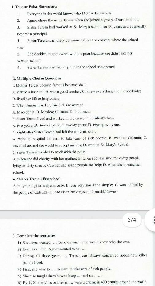 дан текст, нужно выполнить задания: Mother Teresa was a simple nun. She never wanted to be famous, but everyone in the world knew who she was. She received many important awards. She travelled around the world to accept them. She asked people for help. Then she gave everything to the poor. Mother Teresa was born Agnes Gonxha Bojaxhiu in 1910 in what is now Macedonia. She was the youngest of three children. Agnes's father died when she was a child. Her mother made dresses to support the family. Agnes's mother also liked to do charity work, such as visiting the sick. Agnes often went with her, and she enjoyed helping these people. She was a good and religious girl. Even as a child, Agnes wanted to be a nun. When she was 18 years old, she joined a group of nuns in Darjeeling, India. There, she chose the name Teresa. Then she went to Calcutta to work at St. Mary's School. The school was in a convent. Sister Teresa lived in the convent and worked at the school for 20 years. She eventually became the principal. During all those years, Sister Teresa was always concerned about how other people lived. The convent had clean buildings and beautiful lawns. But outside the convent, the streets were dirty and crowded and full of very poor people. One day in 1946. Sister Teresa was riding on a train to Darjeeling. She looked out of the window and saw dirty children. They were wearing rags and sleeping in doorways. Sick and dying people were lying on filthy streets. She loved her work at the school, but she realized that other people needed her help more. At that moment, she believed God sent her a message. She decided to go to work with the poor. Two years later, Sister Teresa left the convent. First, she went to a hospital to learn to take care of sick people. After three months, she was ready to live with the poor and the sick. One day, she saw a group of poor children and called them to her. She told them she was going to open a school. The school had no roof, no walls, and no chairs. On the first day, only five students came. She used a stick to write lessons in the dirt. Several months later, Sister Teresa had many students. Everyone in Calcutta knew about her. A friend let her use part of his house for the school. She taught the children language and math. She also taught them how to keep clean and stay healthy. Soon, other nuns came to help her. Sister Teresa was happy that they wanted to join her. But she told them that life with her was not easy. She said that everyone had to wear the same clothes-white cotton saris. She wanted all the nuns to look like the poor people in India. In 1948, Sister Teresa started her own group of nuns. They were called the Missionaries of Charity. She was their leader, so they called her "Mother" Teresa. The nuns lived in the slums with people who were poor, dirty, and sick. It was hard work and the days were long. But many young nuns came from around the world to join Mother Teresa. One day, Mother Teresa saw an old woman in the street. She took her to a hospital. They refused to help the woman because she was poor, Mother Teresa decided to open a place for the sick and the dying. Later, she started homes for children without families. She also started clinics. Over the years, news of her work spread around the world. Many people sent her donations of money. Others came to work with her in India or other places. By 1990, the Missionaries of Charity were working in 400 centres around the world. Over the years, Mother Teresa received many great awards, such as the Nobel Peace Prize. But she always said her greatest reward was helping people. Her message to the world was, "We can do no great things only small things with great love". She died in 1997 at the age of 87. The whole world mourned her death.