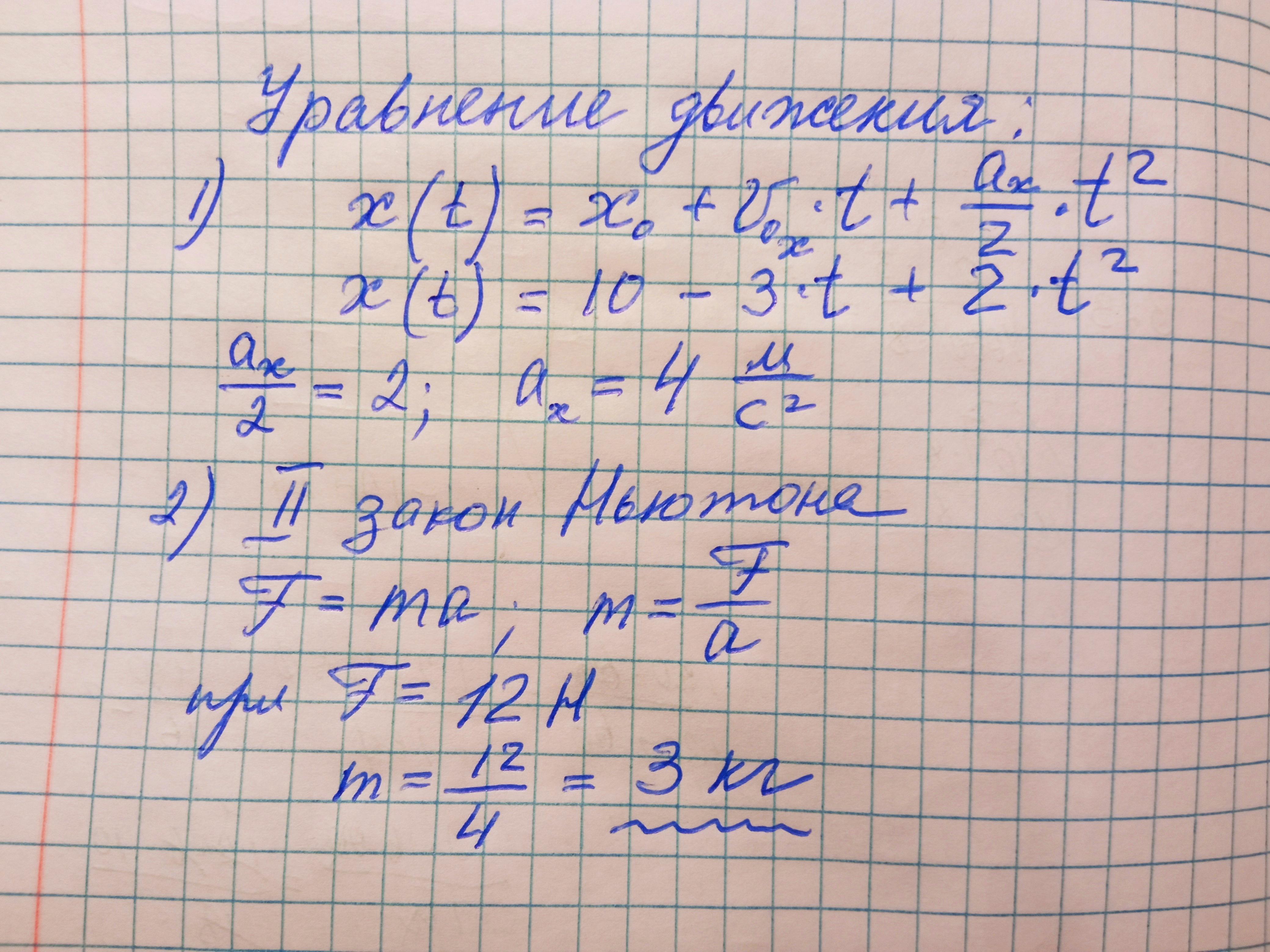Координата прямолінійного руху тіла під дією сили 12Н змінюється за законом х=10-3t+2t2. Визначте масу тіла.