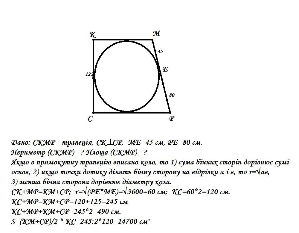 Потрібно знайти периметр і площу прямокутної трапеції, якщо поточна точка дотику її вписаного кола ділить її бічну сторону на відрізки 45 і 80 см.!!!!!!!!