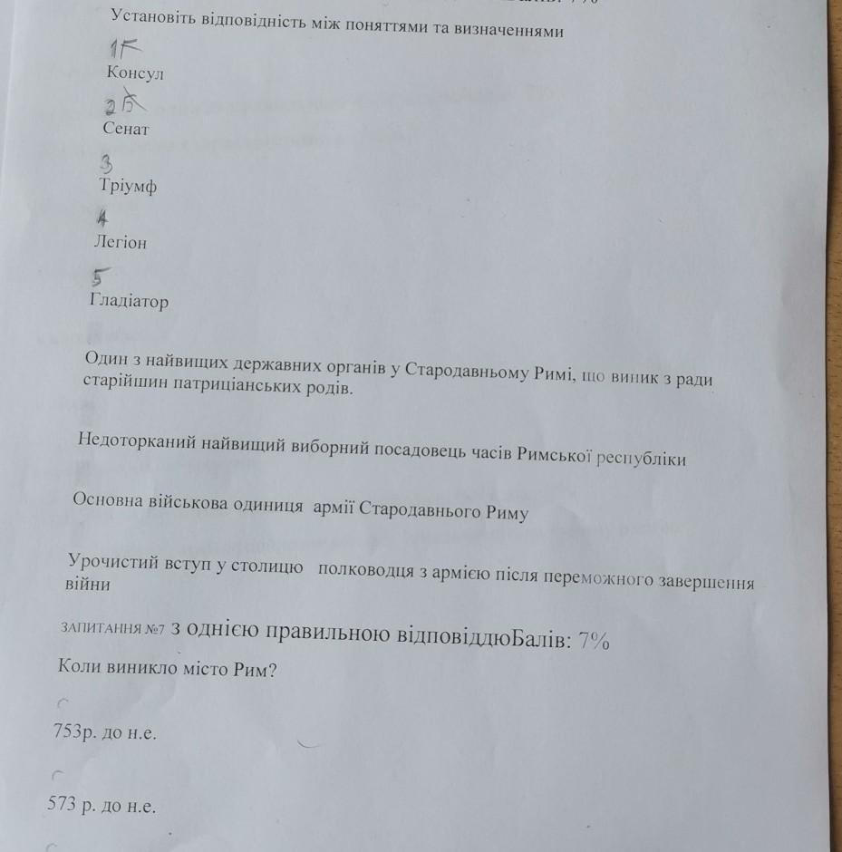Установіть відповідність між поняттями та визначеннями Консул 2 Сенат 3 Тріумф Легіон 5 Гладіатор Один з найвищих державних органів у Стародавньому Римі, що виник з ради старійшин патриціанських родів. Недоторканий найвищий виборний посадовець часів Римської республіки Основна військова одиниця армії Стародавнього Риму Урочистий вступ у столицю полководця з армією після переможного завершення війни відповіддюБалiв: 7% ЗАПИТАННЯ №7 З Однією правильною Коли виникло місто Рим? 753р. до н.е. ( 573 р. до н.е.
