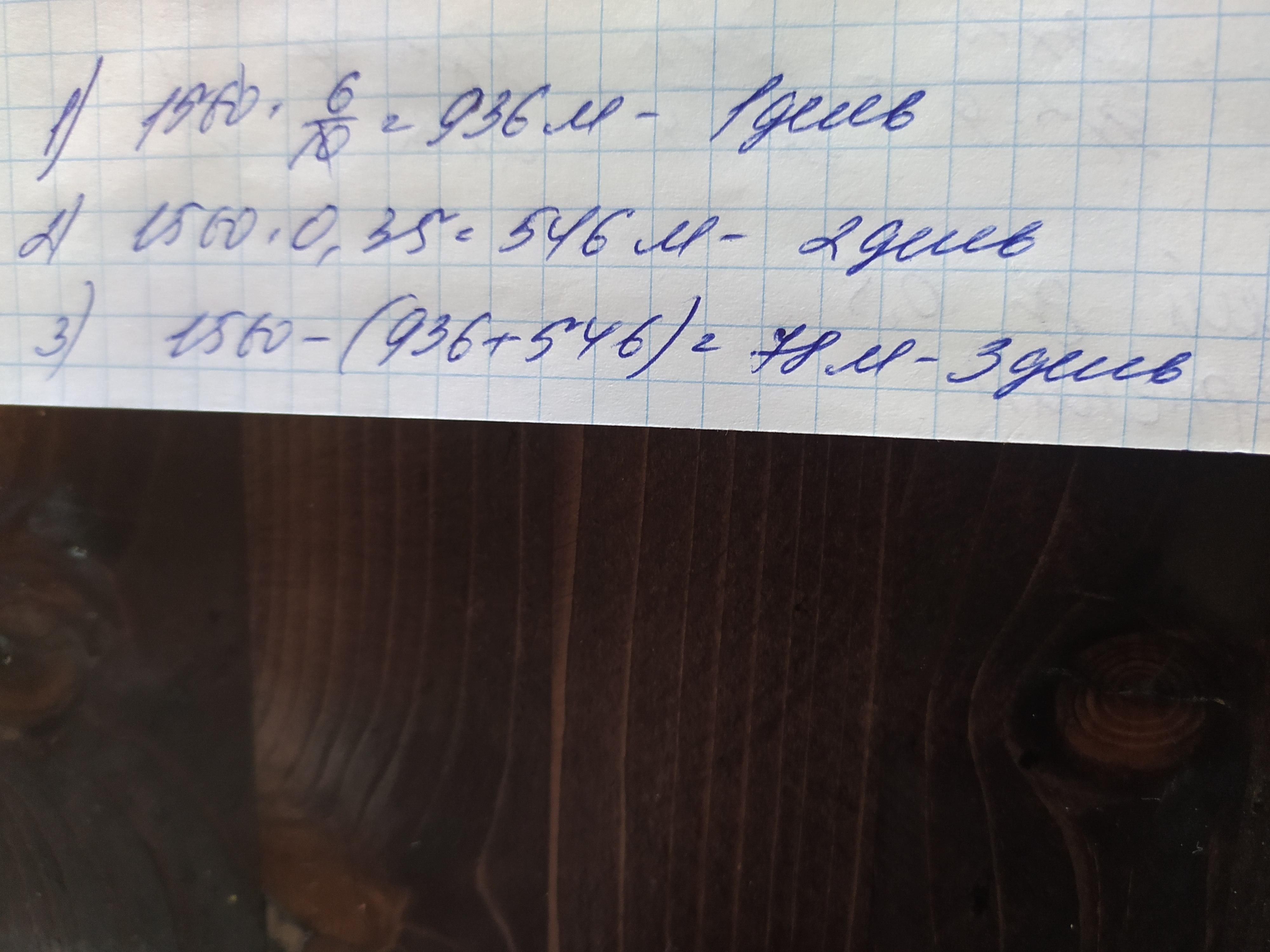 9. За перший день було продано 6/10 з 1560 м завезеної у магазин тканини, за другий - 0,35. Скільки метрів тканини було продано за третій день?