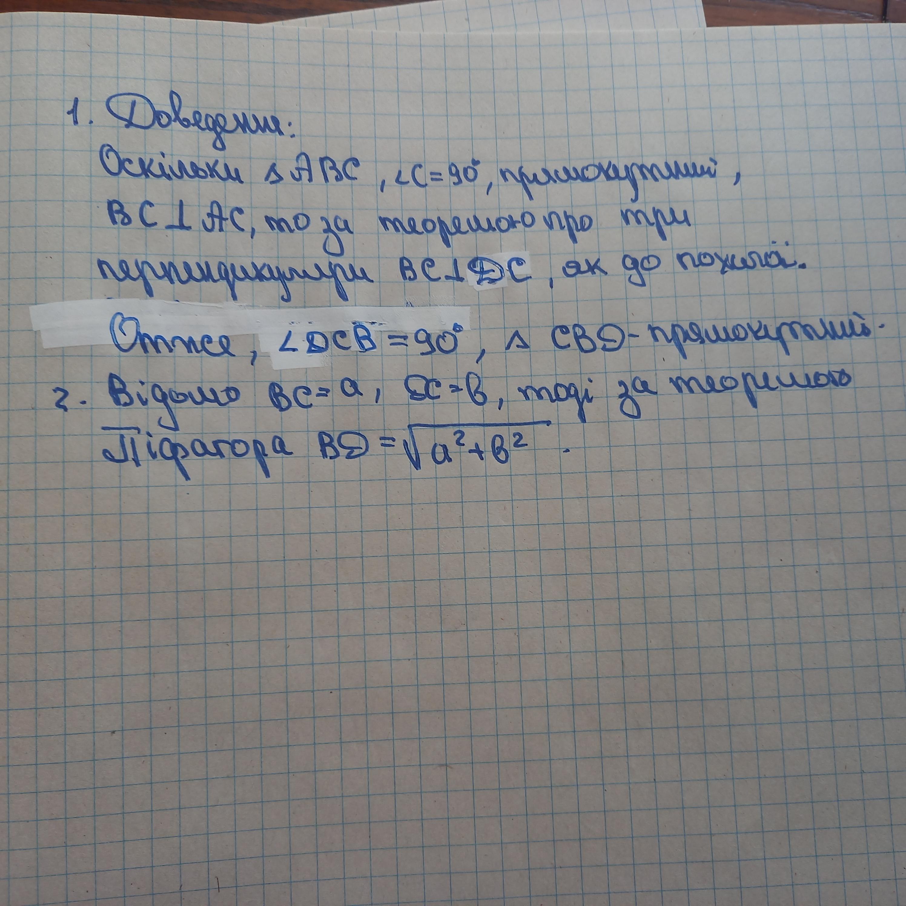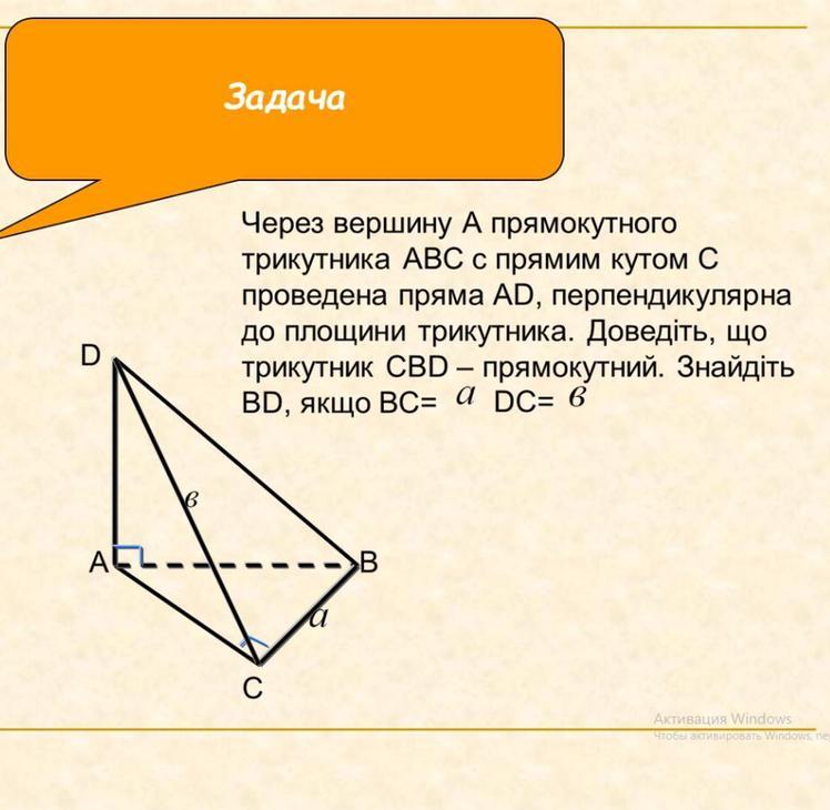 Через вершину А прямокутного трикутника АВС с прямим кутом С проведена пряма AD, перпендикулярна до площини трикутника. Доведіть, що трикутник CBD - прямокутний. Знайдіть BD, якщо ВС=a DC=в