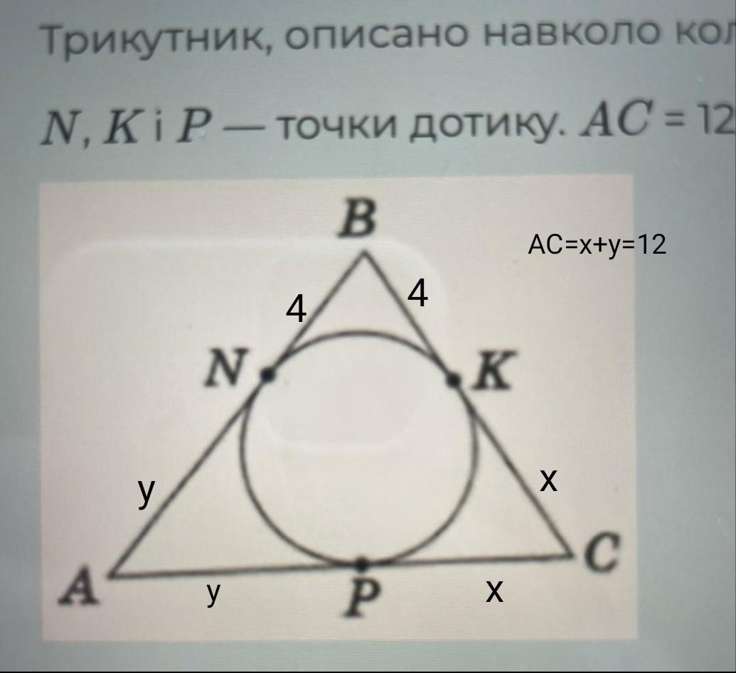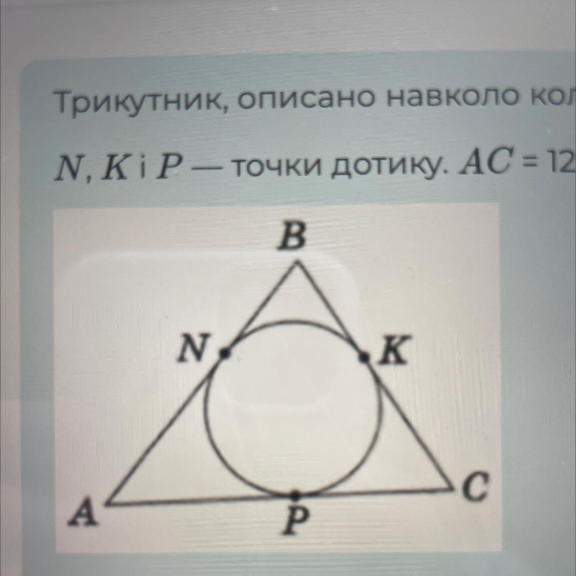 N, K i P-точки дотику. АС = 12 см, ВК = 4 см. Знайдіть периметр трикутника ABC.