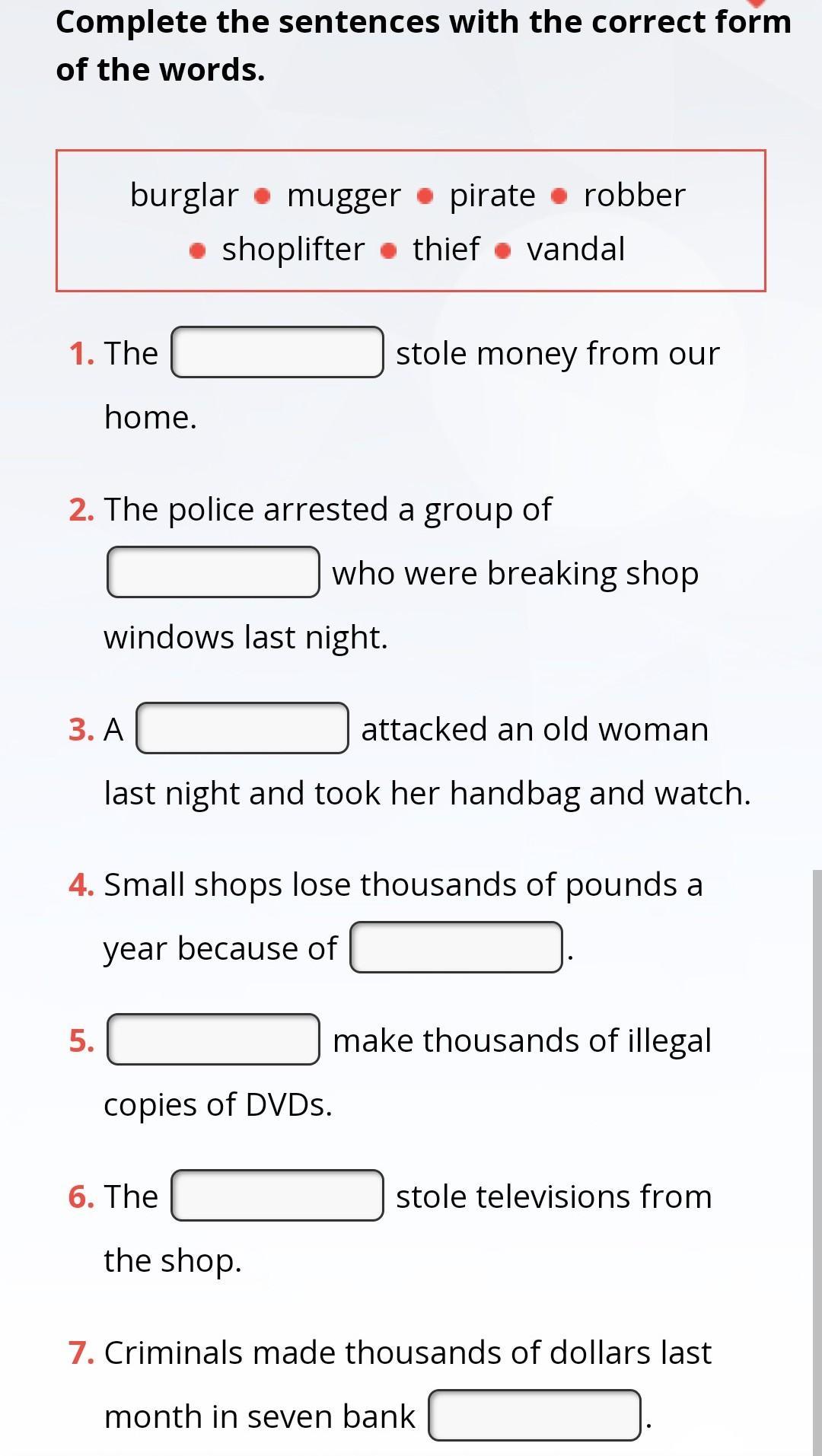 Complete the sentences with the correct form of the words. burglar mugger pirate robber shoplifter thief vandal 1. The home. stole money from our 2. The police arrested a group of who were breaking shop windows last night. 3. A attacked an old woman last night and took her handbag and watch. 4. Small shops lose thousands of pounds a year because of 5. make thousands of illegal copies of DVDs. 6. The stole televisions from the shop. 7. Criminals made thousands of dollars last month in seven bank