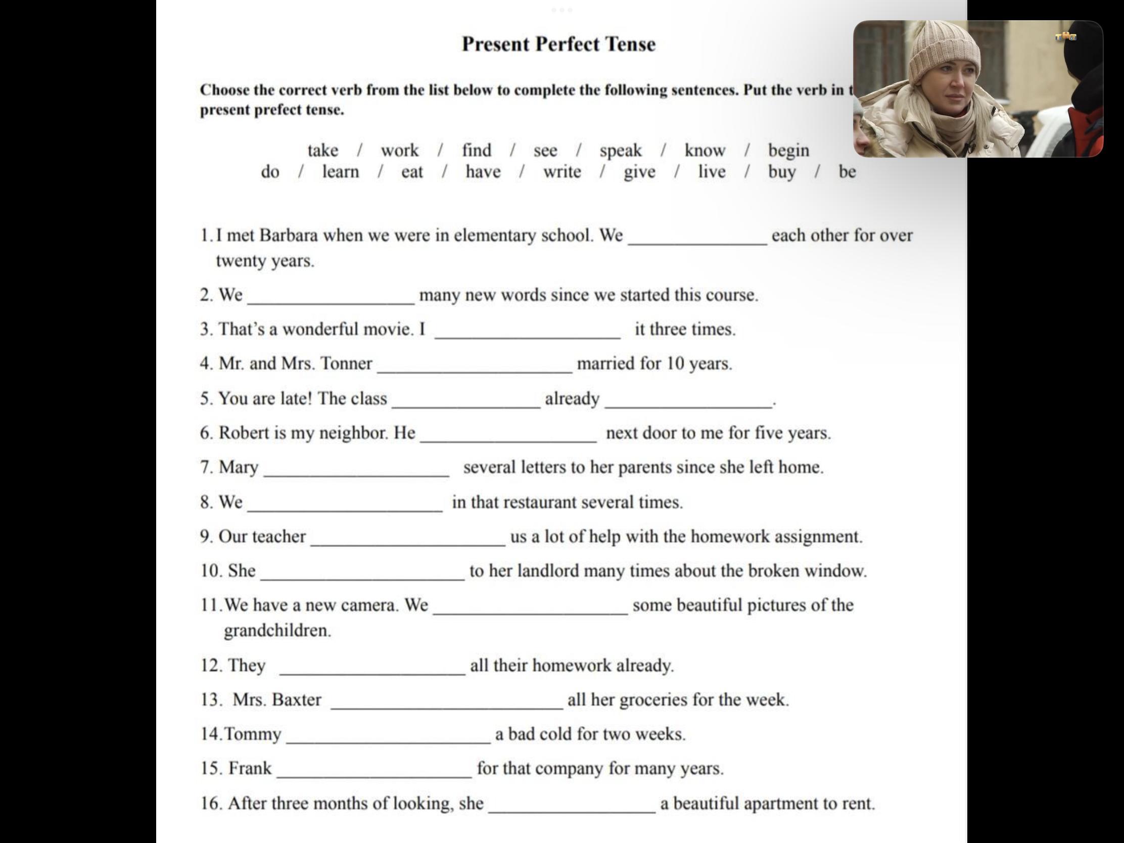 1. have known 2. have learned 3. have seen 4. have been 5. has begun 6. has lived 7. has written 8. have eaten 9. has given 10. has spoken 11. have taken 12. have done 13. has bought 14. has had 15. has worked 16. has found.