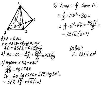 утворює з площиною основи кут 30°. Знайдіть об'єм піраміди.
