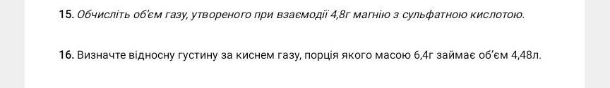 15. Щоб обчислити об'єм газу, утвореного при взаємодії магнію з сульфатною кислотою, спочатку ми повинні встановити реакційну рівняння і знайти мольний співвідношення між магнієм і утвореним газом. Реакція між магнієм (Mg) і сульфатною кислотою (H2SO4) має наступний вигляд: