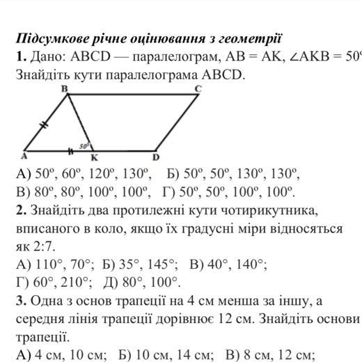 B) 80°, 80°, 100°, 100°, I) 50°, 50°, 100°, 100°.