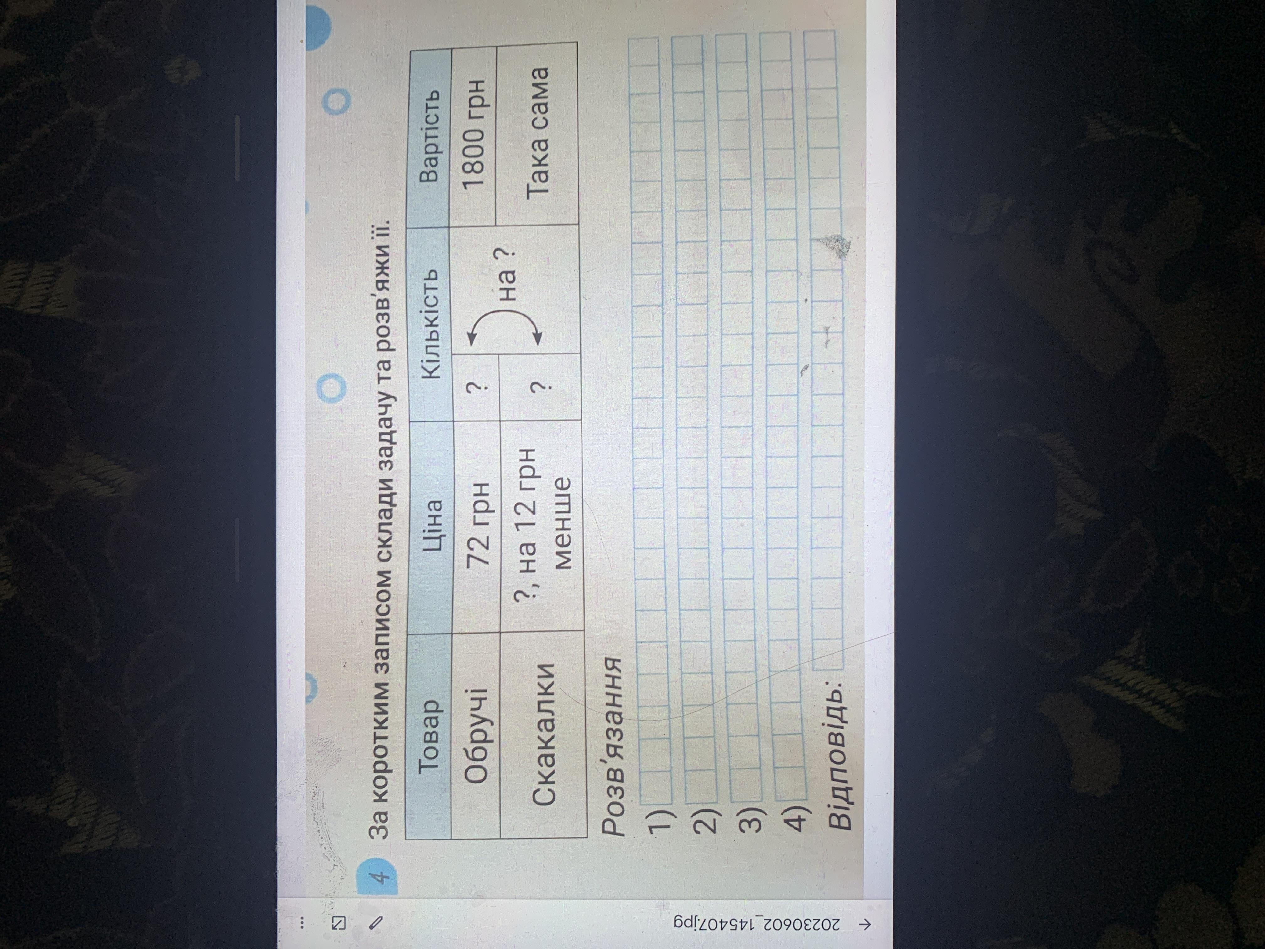 1) 72 - 12 = 60 (грн) - коштує 1 скакалка.