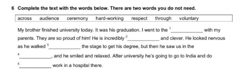 6 Complete the text with the words below. There are two words you do not need. across audience ceremony hard-working respect through voluntary My brother finished university today. It was his graduation. I went to the parents. They are so proud of him! He is incredibly 2 as he walked 3 4 with my and clever. He looked nervous 5 the stage to get his degree, but then he saw us in the and he smiled and relaxed. After university he's going to go to India and do work in a hospital there.