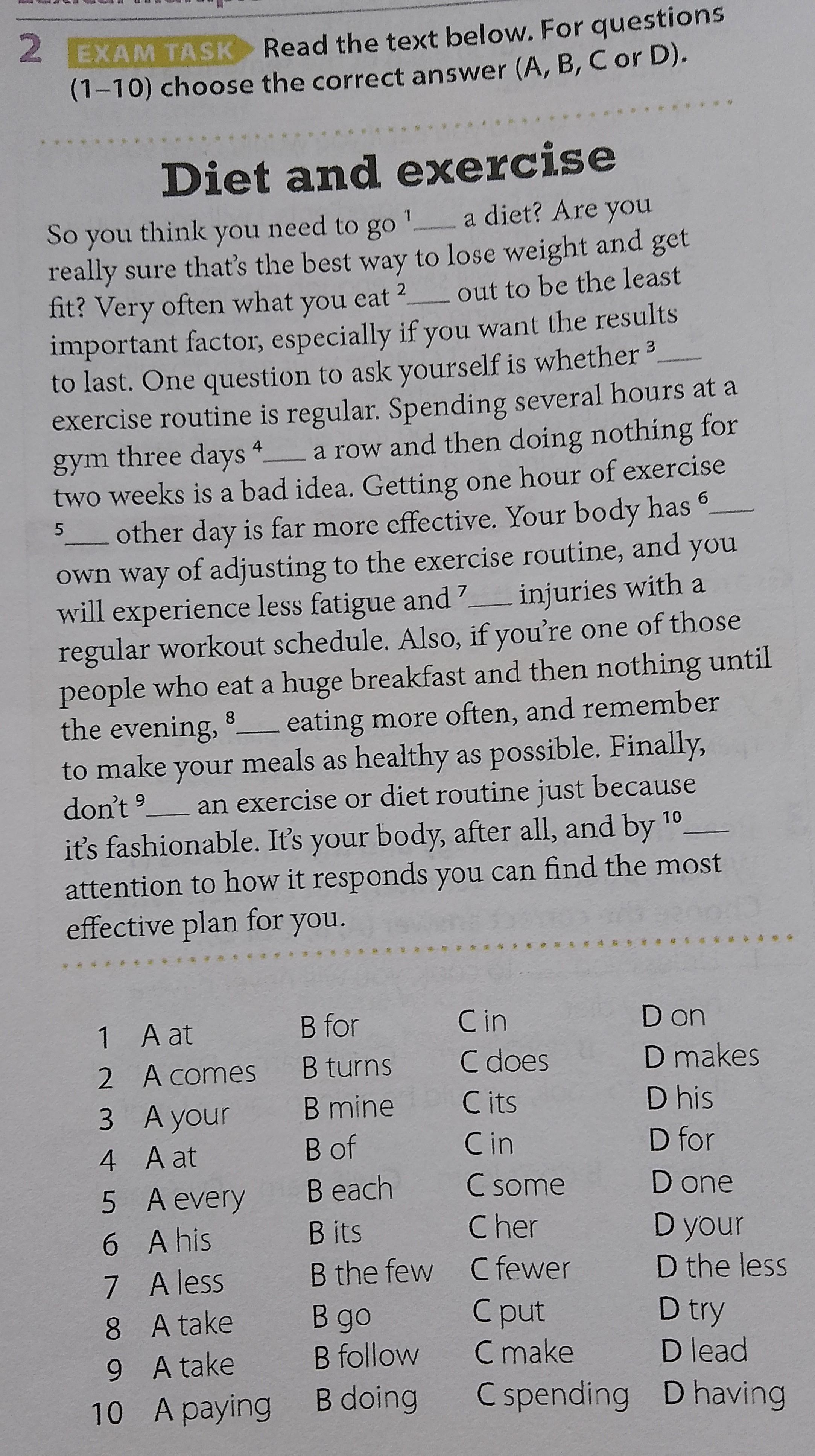 So you think you need to go 1 a diet? Are you really sure that's the best way to lose weight and get fit? Very often what you eat 2 out to be the least important factor, especially if you want the results to last. One question to ask yourself is whether 3 exercise routine is regular. Spending several hours at a gym three days a row and then doing nothing for two weeks is a bad idea. Getting one hour of exercise 5 other day is far more effective. Your body has 6 own way of adjusting to the exercise routine, and you will experience less fatigue and 7 injuries with a regular workout schedule. Also, if you're one of those people who eat a huge breakfast and then nothing until the evening, 8 eating more often, and remember to make your meals as healthy as possible. Finally, don't 9 an exercise or diet routine just because it's fashionable. It's your body, after all, and by 10 attention to how it responds you can find the most effective plan for you.