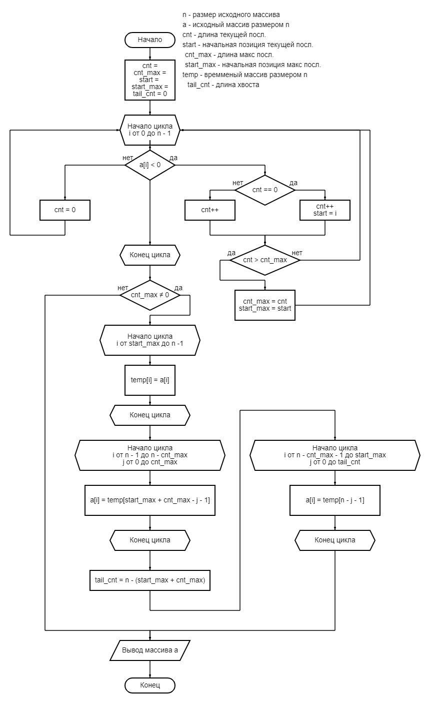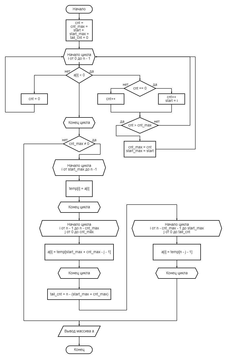 Задача : В одномерном массиве A = (a1, а2, ..., аn) группу элементов, содержащую наибольшее число подряд идущих отрицательных элементов, переписать в «хвост» массива. Элементы массива вводятся случайным образом.